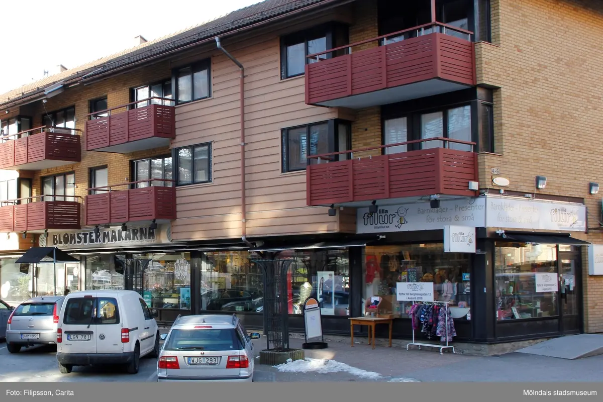 Hörnet på huset med adressen Bergmansgatan 4 i Mölndals Centrum. Bostäder ovanför entré och skyltfönster till affären Lilla Filur samt Blomstermakarna i gatuplanet. Fotografi taget den 26 februari 2018. Byggnadsdokumentation inför rivning.