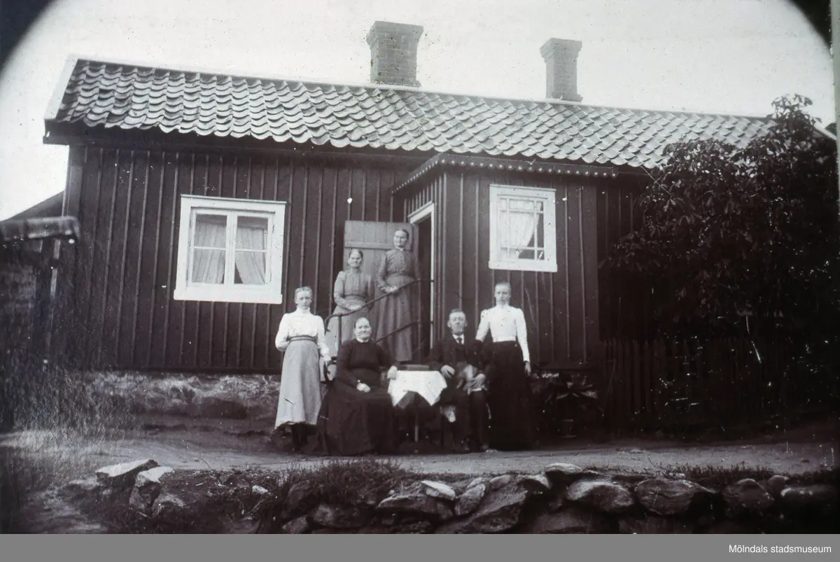 Roten M 30 i Mölndals Kvarnby före ombyggnaden. På bilden ses Karl Rudolf Mattsson med hustrun Helena samt döttrarna Hedvig och Anna. Hedvig blev senare gift Gahrn.