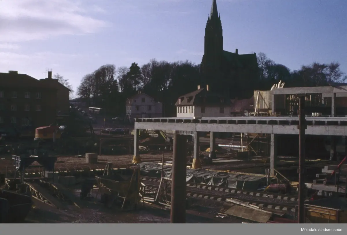 Centrumhuset under byggnation vid Frölundagatan i Mölndals centrum på 1970-talet. I bakgrunden till vänster ses även bebyggelse vid Storgatan.
