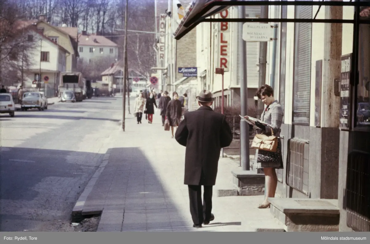 Gångtrafikanter och en kvinna som står och väntar på bussen vid Frölundagatan i Mölndal, 1960-tal.