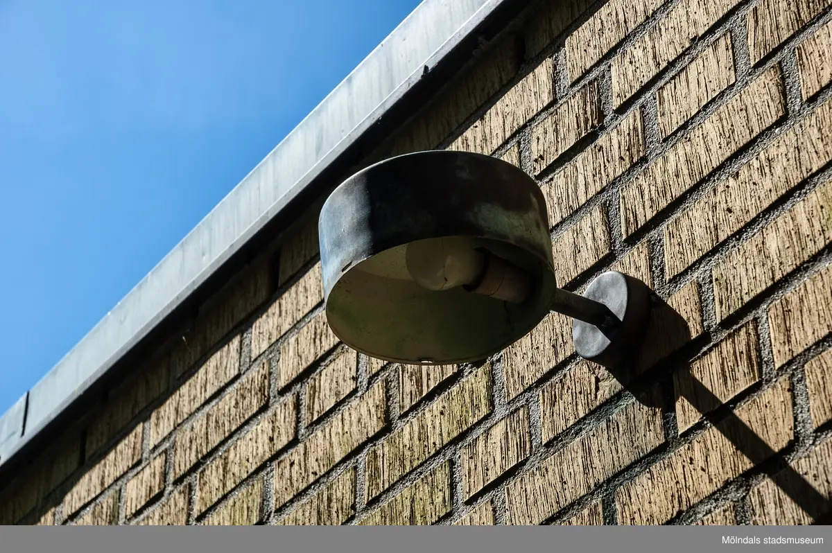 Belysning på fasaden, som är placerad ovanför en entré till byggnad X, tillhörande Mölndals sjukhus i Bosgården, Mölndal. Fotografi taget den 10 juni 2014. Byggnadsdokumentation inför rivning.