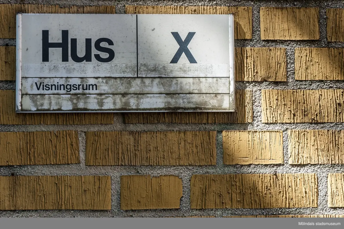 Vit skylt på gult tegel. Texten på skylten lyder "Hus X Visningsrum". Byggnadsdetalj trån byggnad X tillhörande Mölndals sjukhus i Bosgården, Mölndal. Fotografi taget den 10 juni 2014. Byggnadsdokumentation inför rivning.