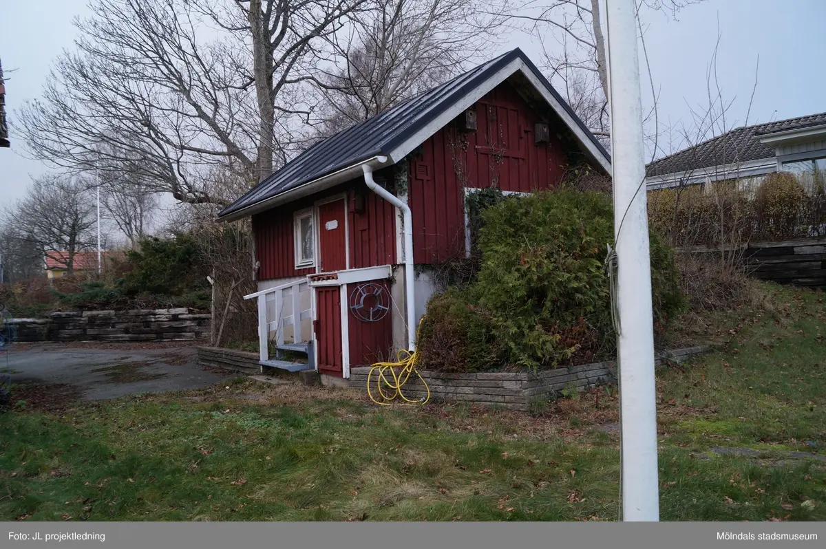 Rödmålat bostadshus med vita knutar på fastigheten Gastorp 2:8, Almvägen 2 i Gastorp, Lindome, i Mölndals kommun. Viss växtlighet förekommer i motivet. Fotografiet är taget 19 november 2020. Byggnadsdokumentation inför rivning.
