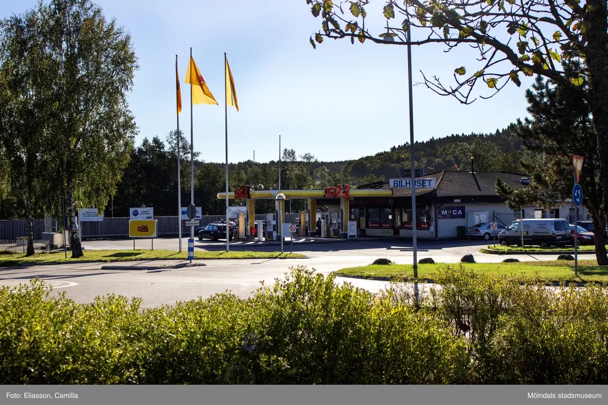 Vy över cirkulationsplats i Lindome centrum mot Bilhuset i Lindome AB/St1 med adress Smidesvägen 1 den 4 oktober 2016. Bilverkstad och bensinstation. Vy mot sydost.