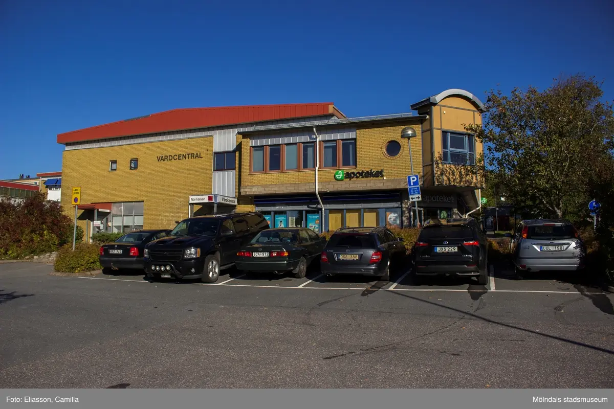 Närhälsan Lindome vårdcentral och Apoteket i huset Almåsgången 7 i Lindome centrum den 4 oktober 2016. Byggnadens fasad vetter mot söder.