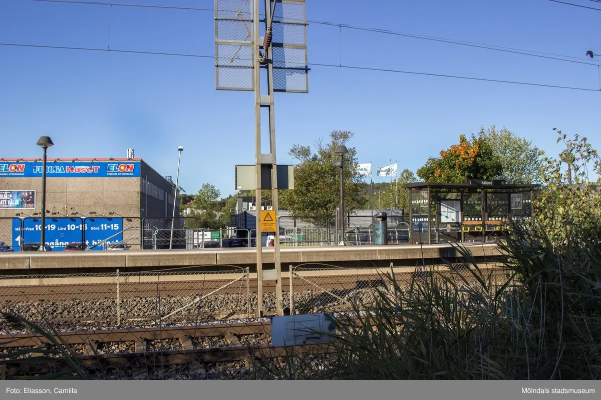 Järnvägsspår och perrong vid Kållereds station i Kållereds centrum den 6 oktober 2016. I bakgrunden ses även affärsbebyggelse vid Bangårdsvägen.