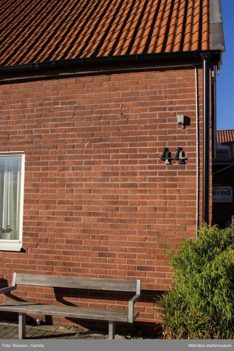 Huset Gamla Riksvägen 44 i Kållereds centrum den 6 oktober 2016. Husnumret 44 på del av den röda tegelfasaden. Byggnaden inrymmer vårdcentralen Nötkärnan Kållered. Framför huset står en träbänk.
