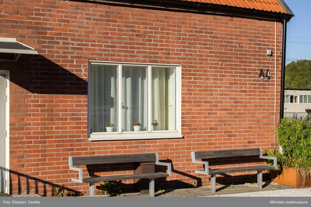 Fasad i rött tegel med ett fönster till huset Gamla Riksvägen 44 i Kållereds centrum den 6 oktober 2016. Byggnaden inrymmer vårdcentralen Nötkärnan Kållered. Framför huset står två träbänkar.