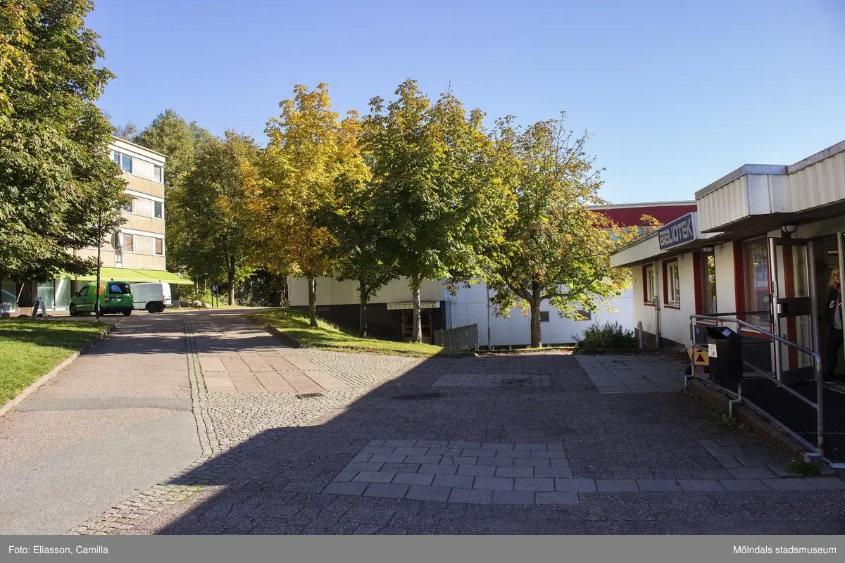 Parti av Sagbrovägen i Lindome centrum den 4 oktober 2016. Vy mot öster. Närmast till höger ses entré till Lindome bibliotek. Bibliotekets adress är Sagbrovägen 30. Till vänster ses Almåsgångens mynning i Sagbrovägen.