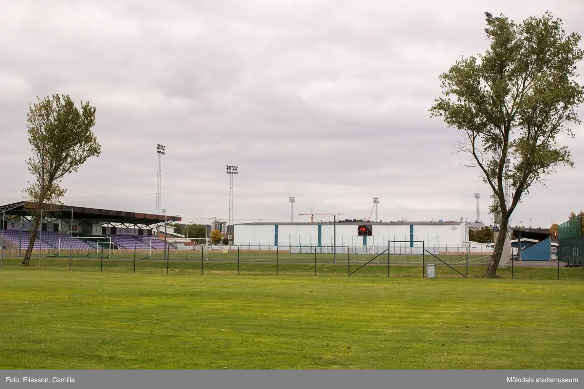 Fotbollsplan och läktare till Åbyvallen, som har adressen Idrottsvägen 3 i Åby, Mölndal, den 11 oktober 2016. Vy mot norr.