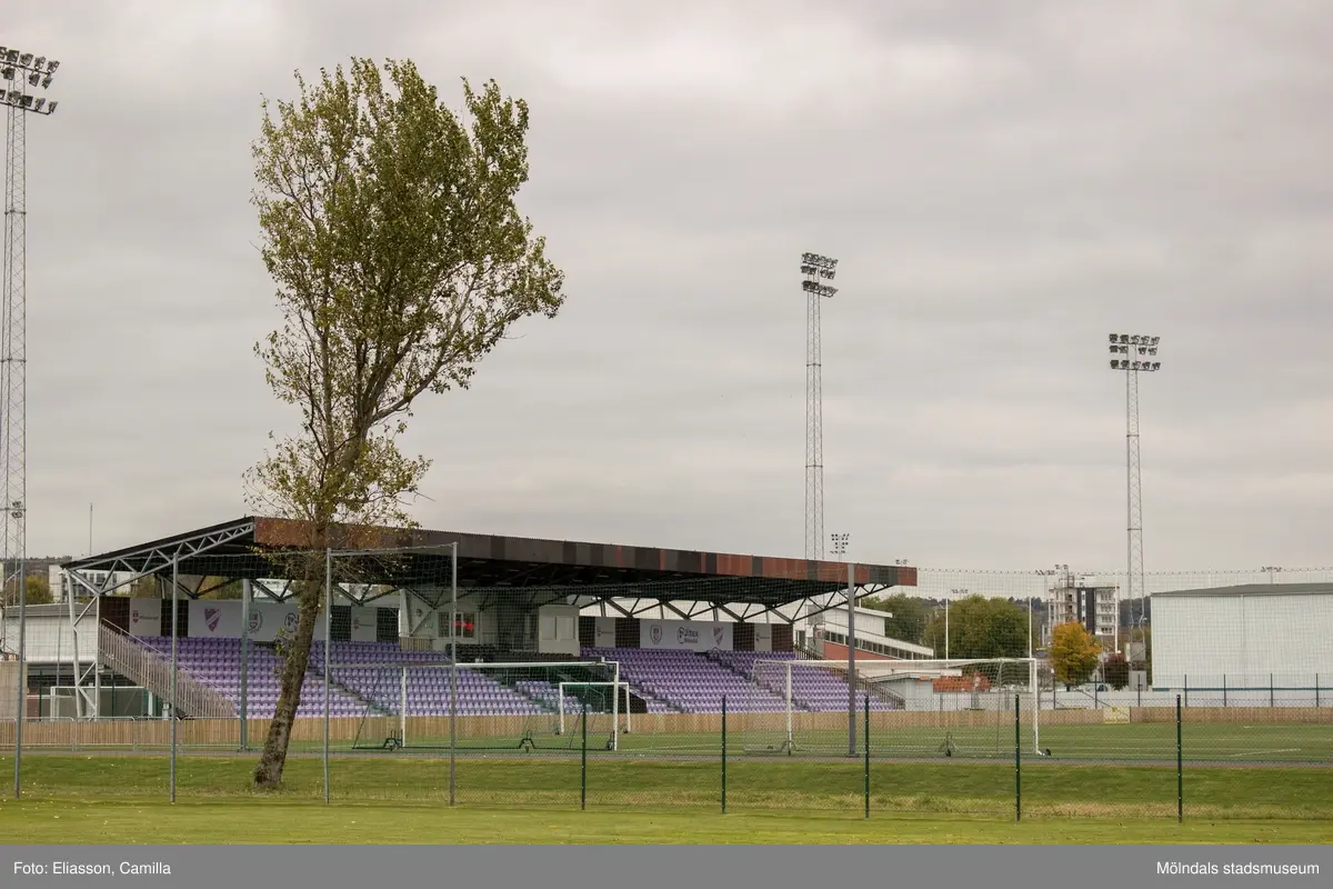 Fotbollsplan och läktare till Åbyvallen, som har adressen Idrottsvägen 3 i Åby, Mölndal, den 11 oktober 2016.