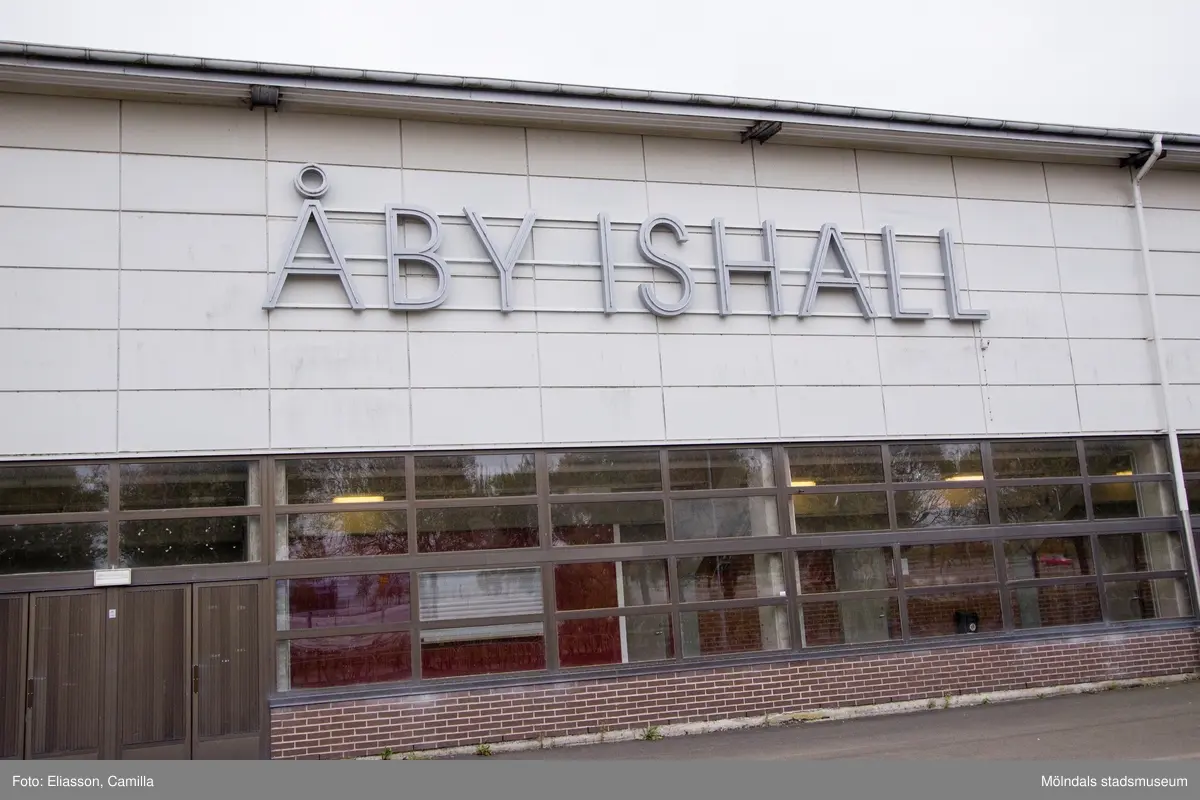 Åby ishall med adress Idrottsvägen 3 i Åby, Mölndal, den 11 oktober 2016. Fasaden vetter mot norr.