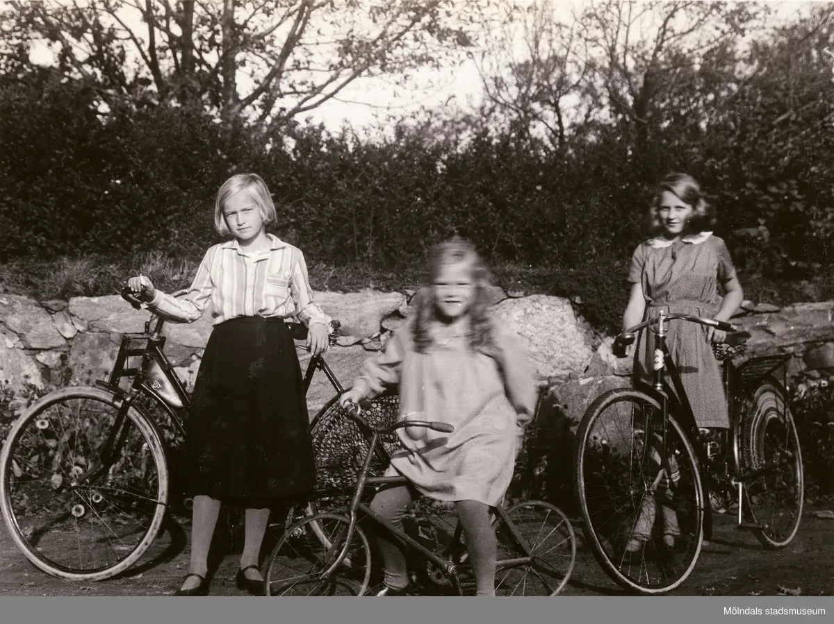 Ulla till höger på sin cykel vid muren. I mitten Bibbi samt till vänster en kusin.
