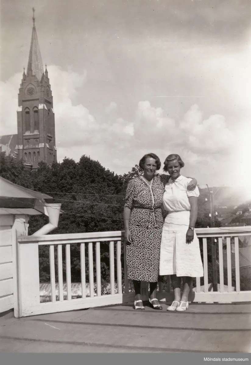 Mamma Laila Björck med dottern Bibbi på verandan till Dr Björcks villa, Villa Björckås, i Åby, Mölndal, i augusti 1938. Laila var hustru till doktor Erik Björck.