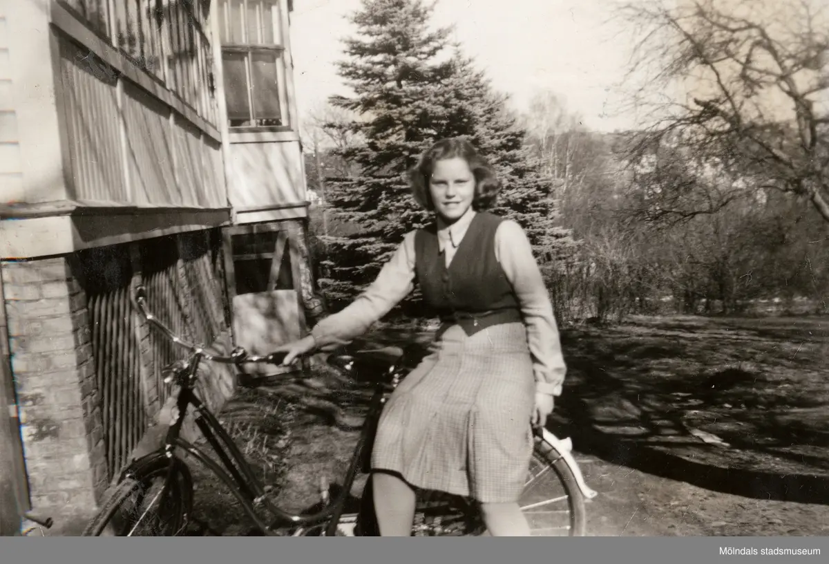 Bibbi Björck på sin cykel utanför Dr Björcks villa, Villa Björckås, i Åby, Mölndal, i april 1941. Bibbi var dotter till doktor Erik Björck med hustru Laila.