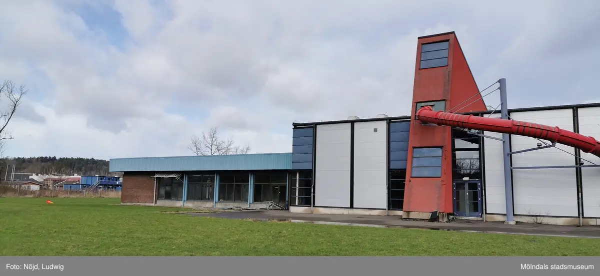 Åbybadet (ursprungligt namn är Åby Simhall) med adress Idrottsvägen 9 i Åbyområdet i Mölndal. Fasader mot söder. Fotografiet är taget den 12 februari 2020. Byggnadsdokumentation inför rivning.