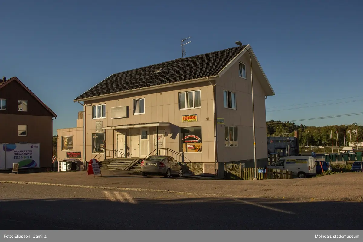 Huset Gamla Riksvägen 40 i Kållereds centrum den 6 oktober 2016. Byggnaden inrymmer Pimol Thaimassage, Frisör Studio Elafonissi samt Kållereds Skomakeri i gatuplanet.