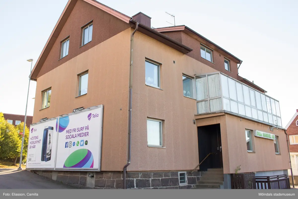 Norra gaveln och västra fasaden (baksidan) av huset Gamla Riksvägen 42 i Kållereds centrum den 6 oktober 2016. Byggnaden inrymmer butiken Kållereds Gammalt & Nytt i gatuplanet. På fasaden sitter en affärsskylt för DEA handel AB.