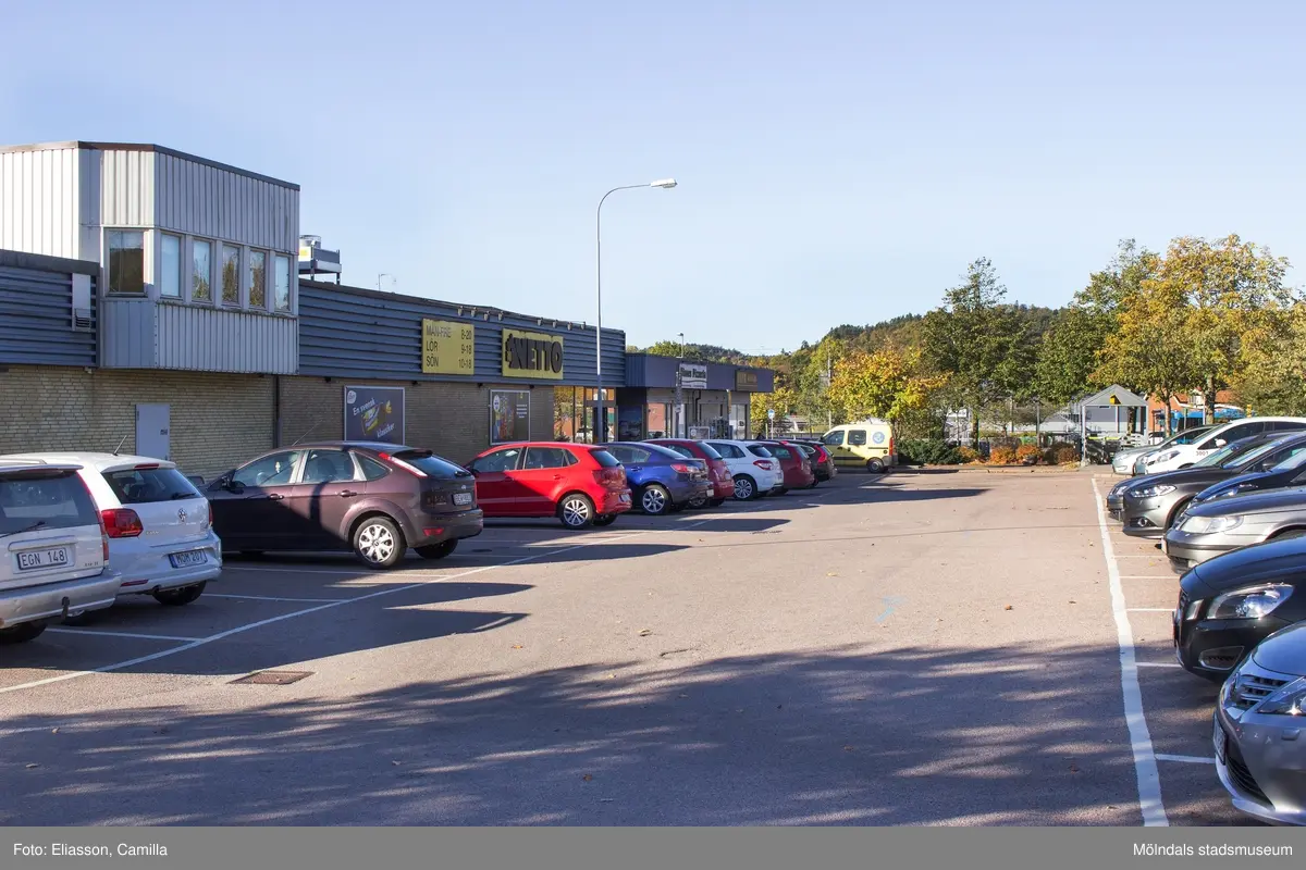 Vy från Våmmedalsvägen mot väster. Parkeringsplats utanför Netto-affären i Kållereds centrum den 6 oktober 2016. Byggnaden har adress Gamla Riksvägen 67.