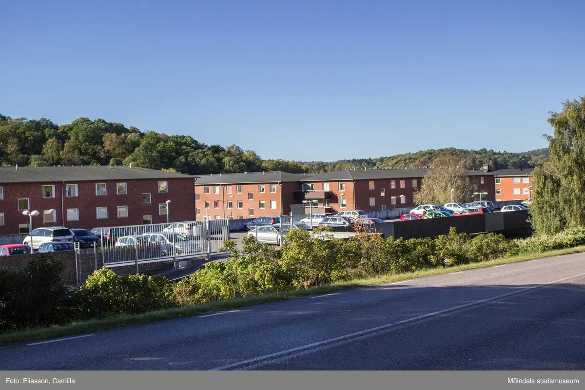 Våmmedal i Kållered den 6 oktober 2016. Vy från Streteredsvägen mot bebyggelse vid Våmmedalsvägen. Närmast ses ett parkeringshus. Vy mot sydväst.