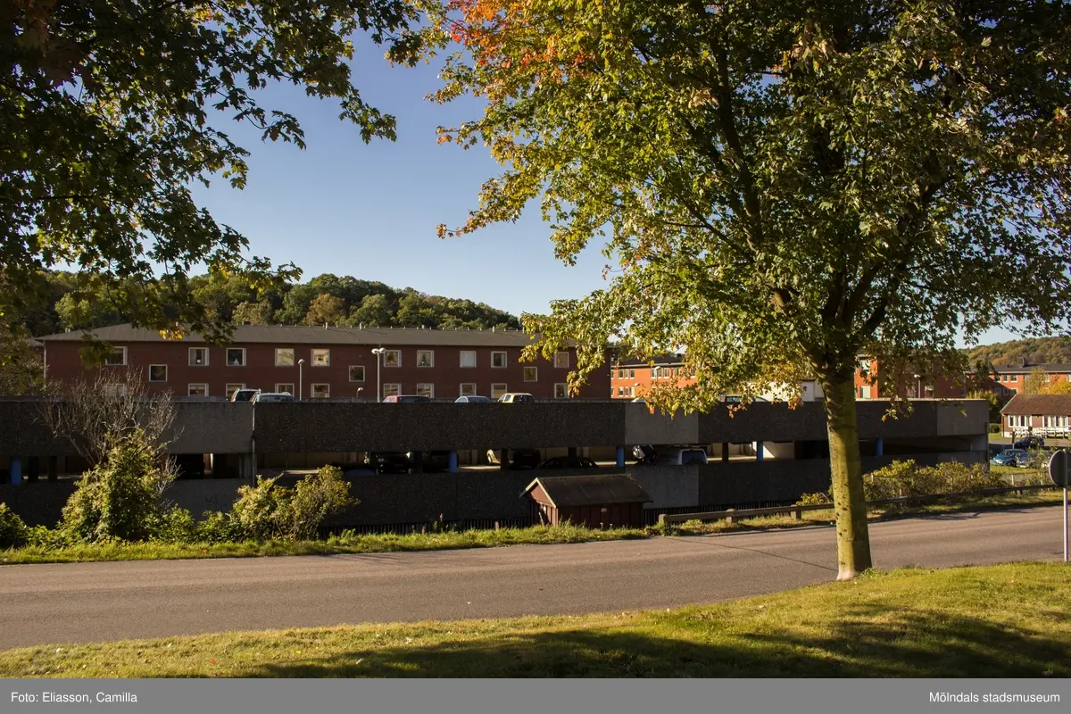 Våmmedal i Kållered den 6 oktober 2016. Vy från Streteredsvägen mot bebyggelse vid Våmmedalsvägen. Närmast ses ett parkeringshus. Vy mot sydväst.