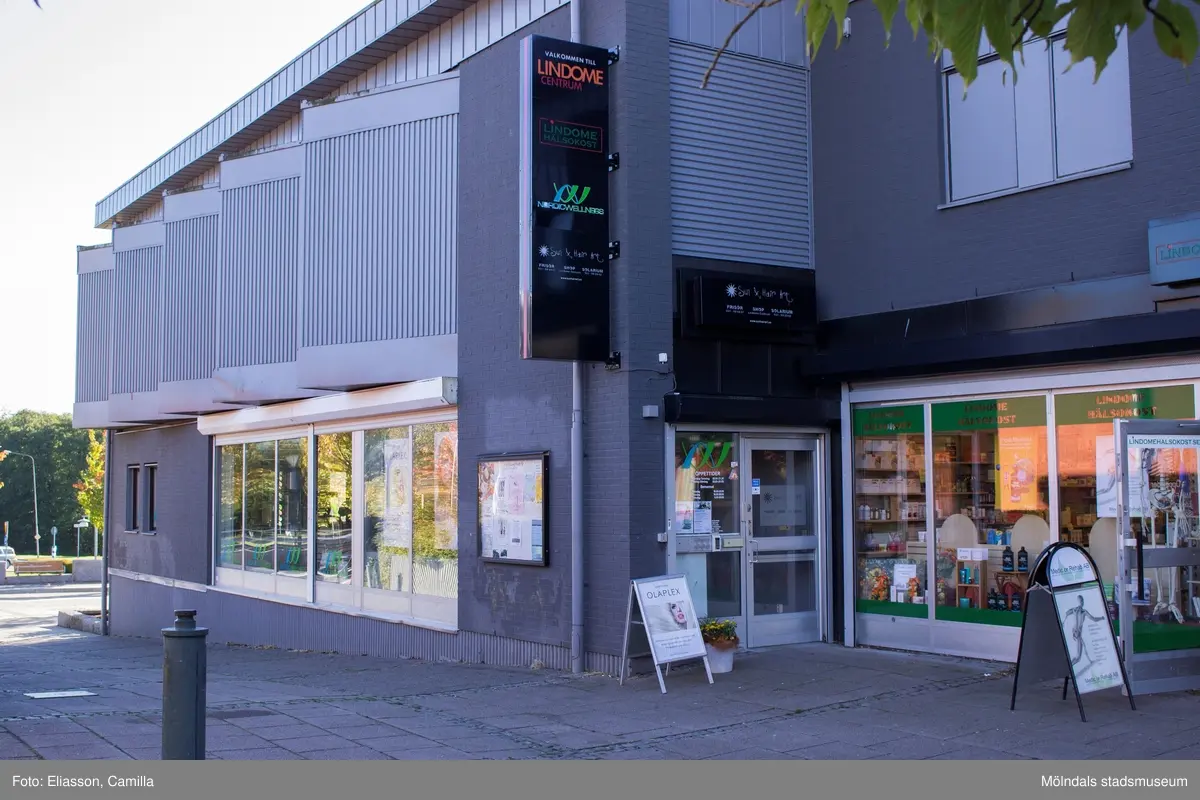Huset Almåsgången 1 i Lindome centrum den 4 oktober 2016. Fasaden vetter mot norr. Bland verksamheterna i huset ses Nordic Wellness och Lindome Hälsokost.