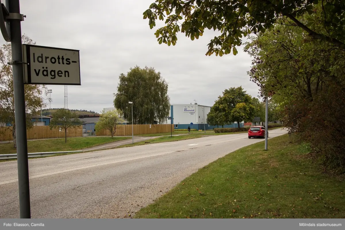 Idrottsvägens sträckning västerut från dess mynning i Åbyvägen, den 11 oktober 2016. I bakgrunden ses Åby badmintonhall med adress Idrottsvägen 1 i Åby, Mölndal.