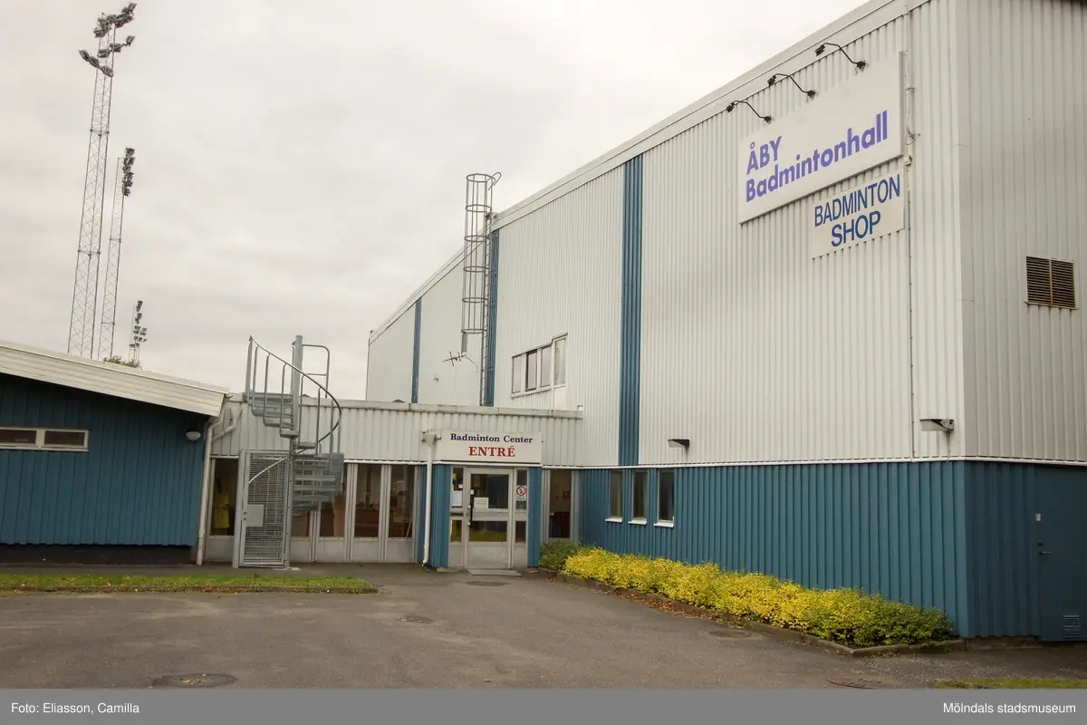 Entré till Åby badmintonhall som har adress Idrottsvägen 1 i Åby, Mölndal, den 11 oktober 2016. Gaveln vetter mot öster.