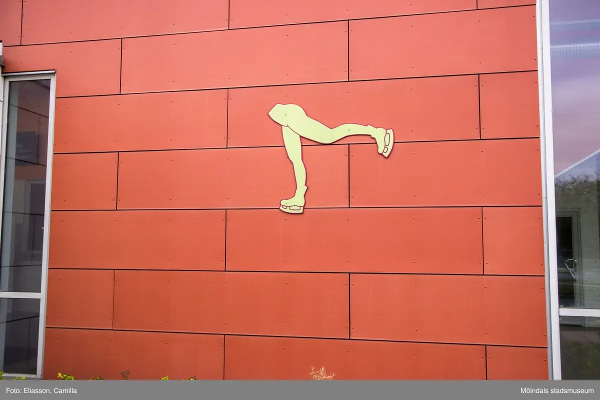 Del av fasaden till Åby ishall som har adress Idrottsvägen 3 i Åby, Mölndal, den 11 oktober 2016. På fasaden, som vetter mot öster, sitter ett konstverk.