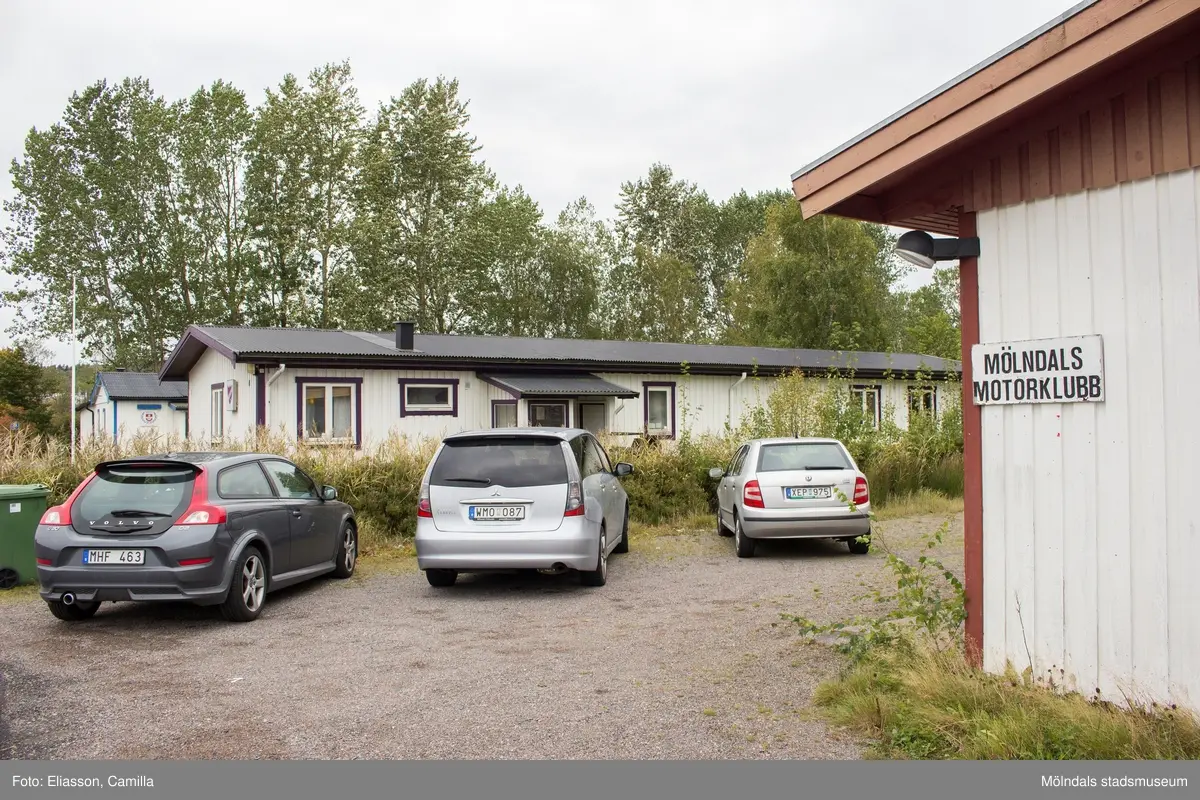 Ett par bilar står parkerade utanför Mölndals Motorklubbs klubbstuga med adress Idrottsvägen 17 i Åby, Mölndal, den 11 oktober 2016.