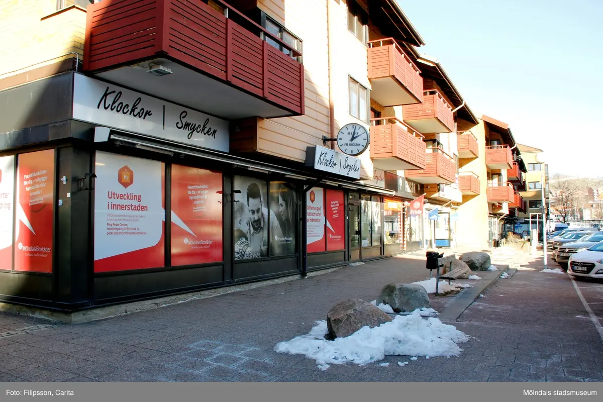 Hörnet på huset med adressen Bergmansgatan 6 i Mölndals Centrum. Bostäder ovanför entré och skyltfönster till F.M. Ericsson Ur & Guldsmide AB, Salong Hårfager och Direkten Mölndal Cigarr & Tobak i gatuplanet. Fotografi taget den 26 februari 2018. Byggnadsdokumentation inför rivning.