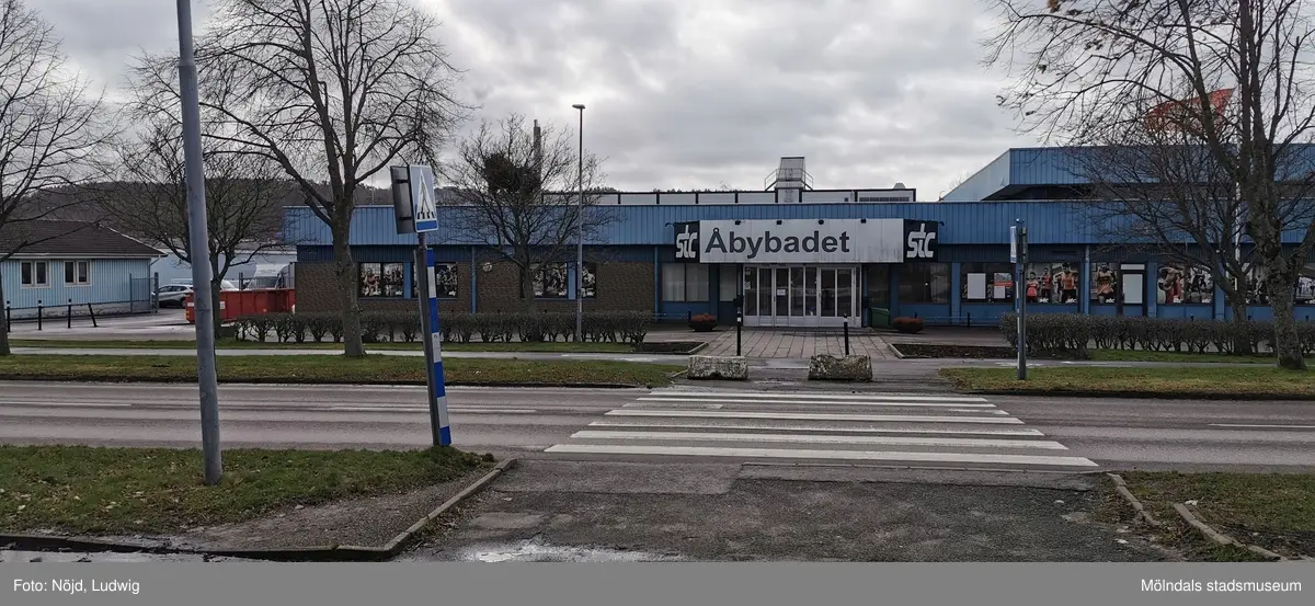 Åbybadet (ursprungligt namn är Åby Simhall) med adress Idrottsvägen 9 i Åbyområdet i Mölndal. Fasad och entré mot norr. Vy över Idrottsvägen. Fotografiet är taget den 12 februari 2020. Byggnadsdokumentation inför rivning.