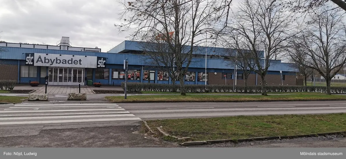 Åbybadet (ursprungligt namn är Åby Simhall) med adress Idrottsvägen 9 i Åbyområdet i Mölndal. Fasad och entré mot norr. Vy över Idrottsvägen. Fotografiet är taget den 12 februari 2020. Byggnadsdokumentation inför rivning.