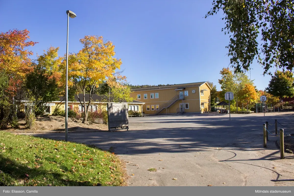 Östergårdsskolan med tillhörande skolgård. Skolan har adress Våmmedalsvägen 25. Våmmedal i Kållered den 6 oktober 2016. Vy mot nordost.