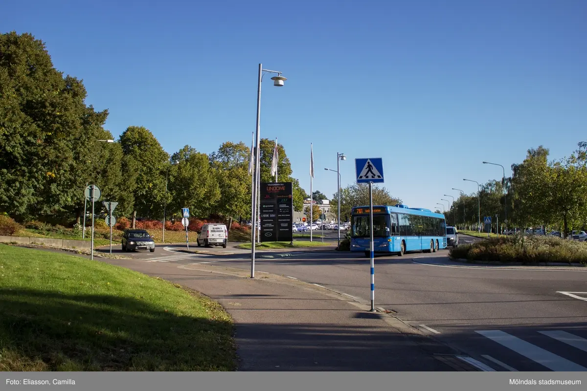 Trafik vid cirkulationsplats som binder samman Industrivägen, Elementvägen och Almåsgången i Lindome centrum den 4 oktober 2016. Vy mot nordost.