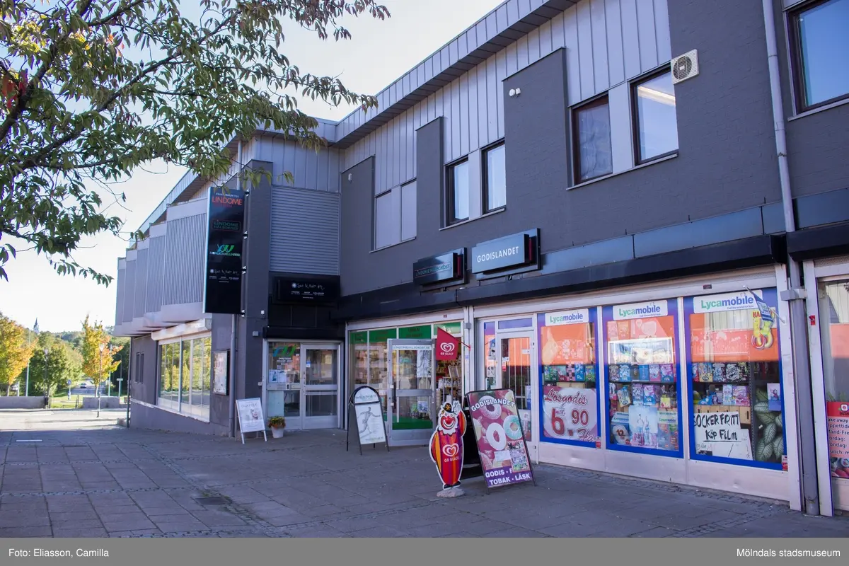 Affärsverksamheter i huset Almåsgången 1 i Lindome centrum, den 4 oktober 2016. Från vänster ses Nordic Wellness, Lindome Hälsokost samt Godislandet. Foto mot öster. Fasaden vetter mot norr.