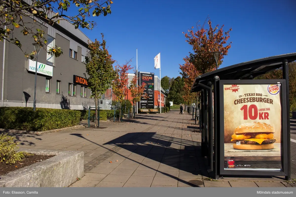 Busshållplats i Lindome centrum den 4 oktober 2016. Till vänster ses närmast huset Almåsgången 1 samt lite längre bort Almåsgången 2. Vy not norr.