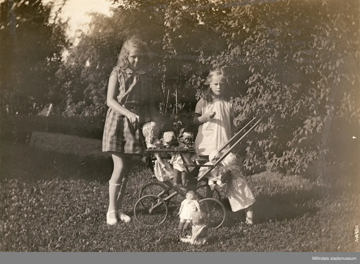 Sommarbild från Villa Björckås trädgård. Fotografi taget i juni 1930. Ulla och Bibbi med sina dockor. Ulla lekte med dockor till hon var 15 år.