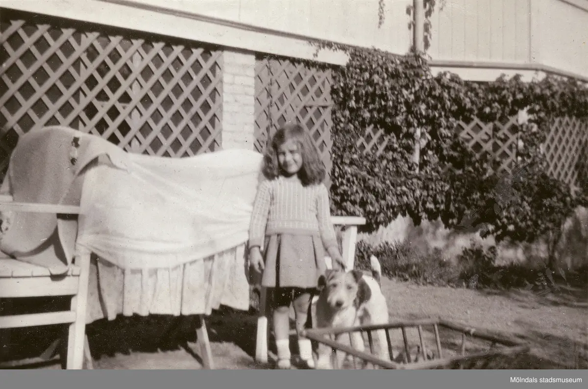 Porträtt av liten flicka med hund i trädgården till Dr Björcks villa, Villa Björckås, i Åby, Mölndal. Okänt årtal. Möjligen en släkting från Italien på besök.
