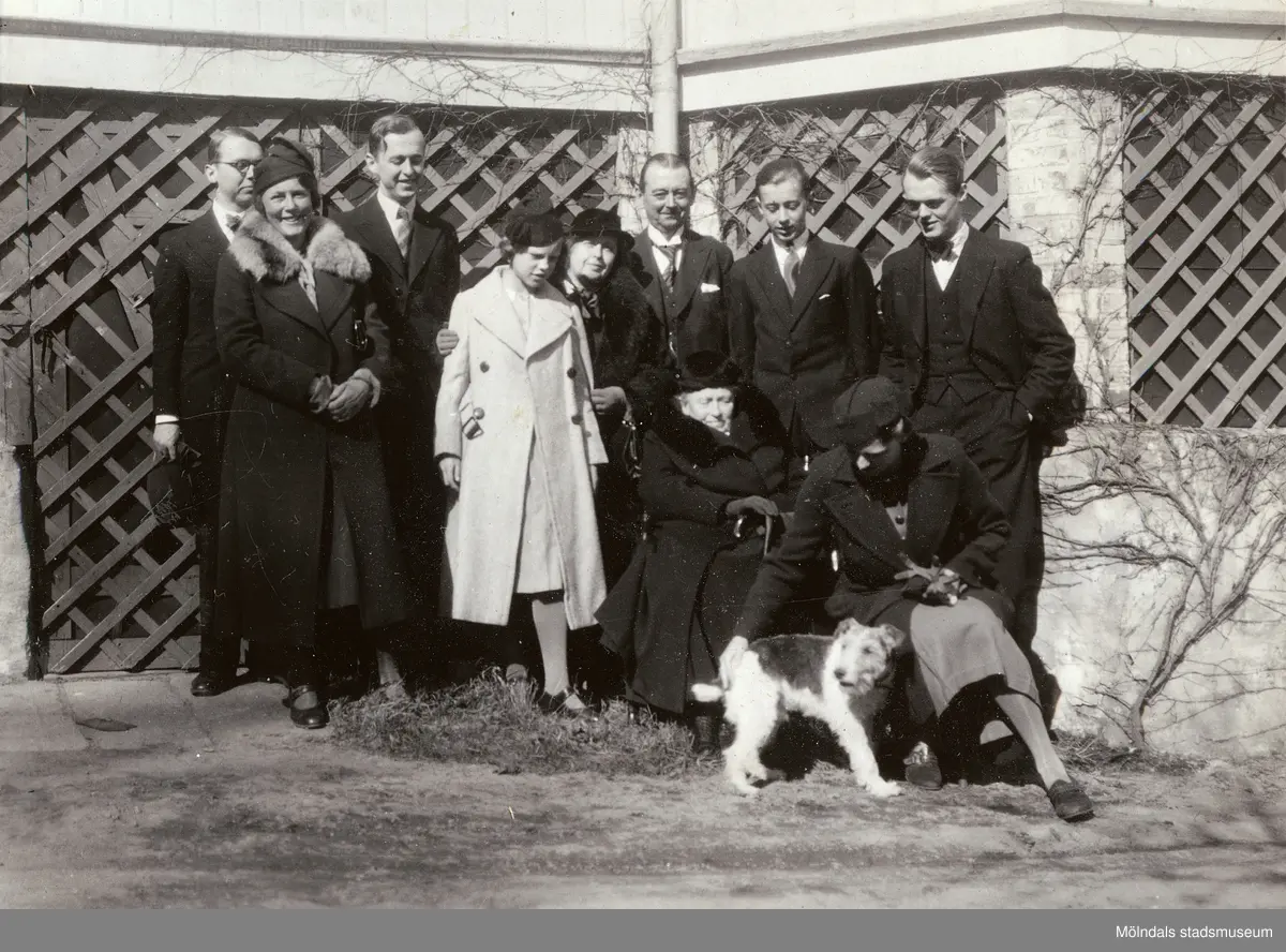 Många gäster och fester hade Erik och Laila Björck. Här ses några av gästerna uppställda för ett grupporträtt vid Dr Björcks villa, Villa Björckås, i Åby, Mölndal. Okänt årtal. Laila Björck i kappan med päls.