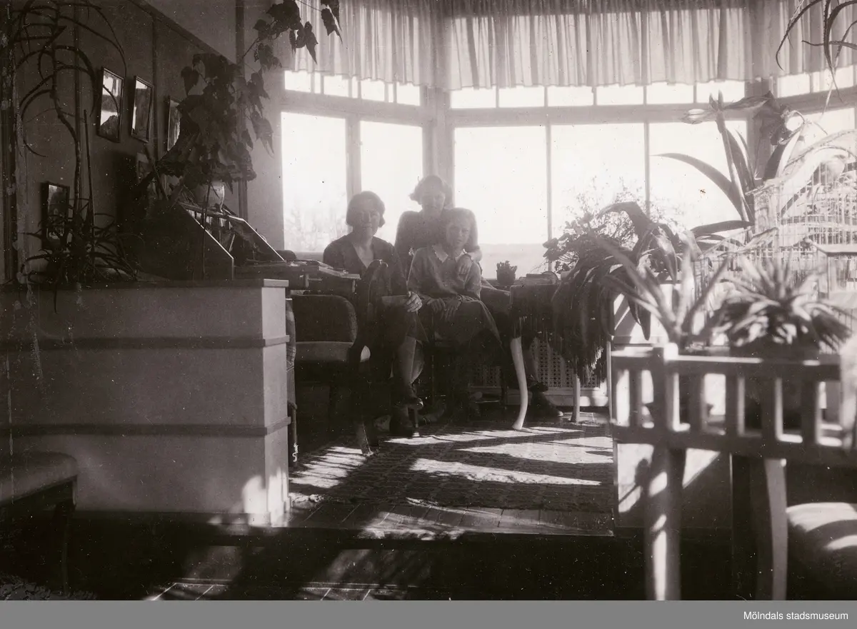 Laila Björck i inneverandan till Dr Björcks villa, Villa Björckås, i Åby, Mölndal, där hon hade mycket växter. Okänt årtal. Laila var hustru till doktor Erik Björck. Två andra kvinnor ses på bilden, möjligen döttrarna Ulla och Bibbi.