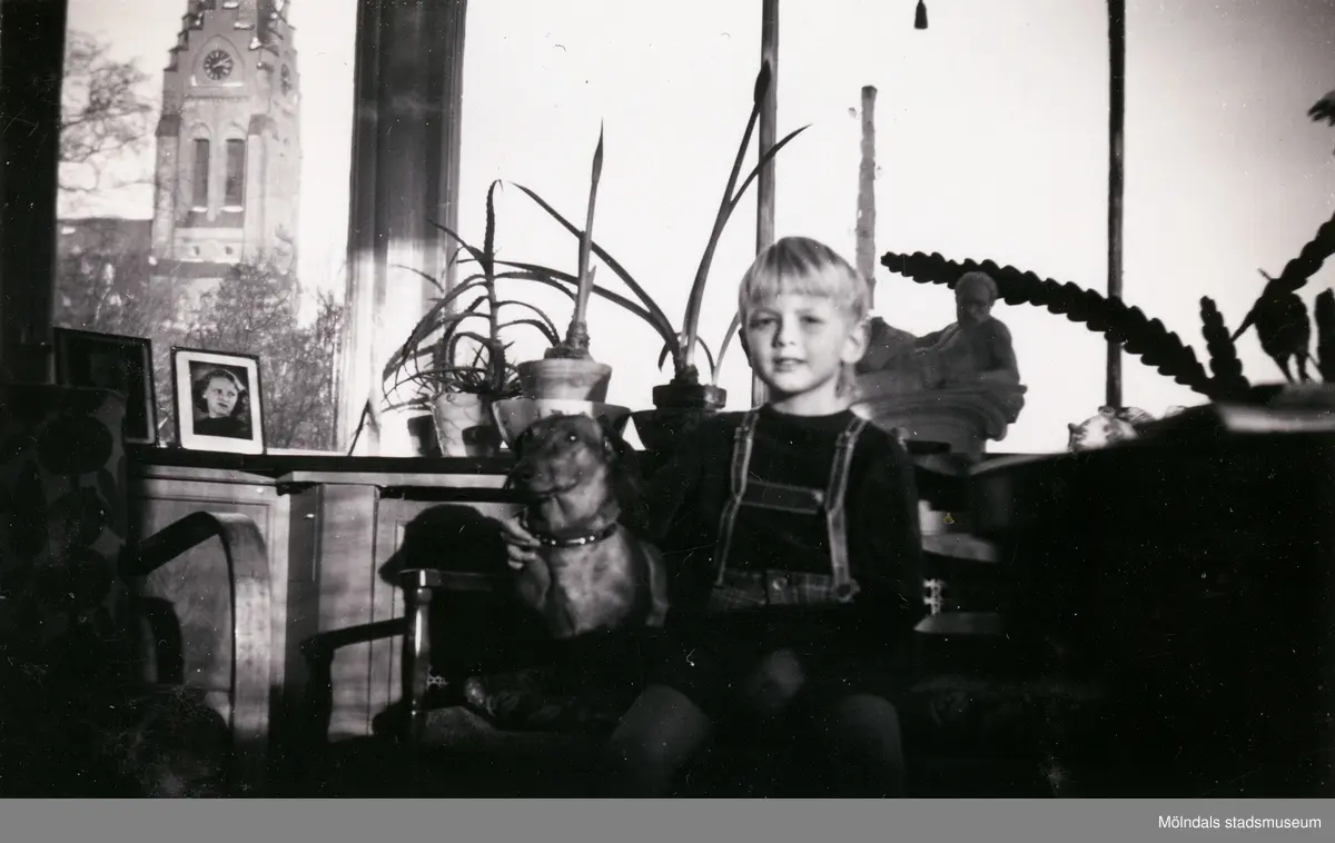 Stefan Gramén tillsammans med en hund i inneverandan till Dr Björcks villa, Villa Björckås, i Åby, Mölndal, julen 1954-1955. Stefan är son till Ulla Björck och barnbarn till doktor Erik Björck med hustru Laila. Syster till Angelica Börjesson.