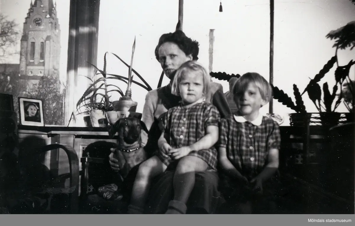 Mamma Ulla tillsammans med sina flickor, Angelica (född 1951) till vänster och Susanne (född 1950) till höger, samt en hund i inneverandan till Dr Björcks villa, Villa Björckås, i Åby, Mölndal, julen 1954-1955.