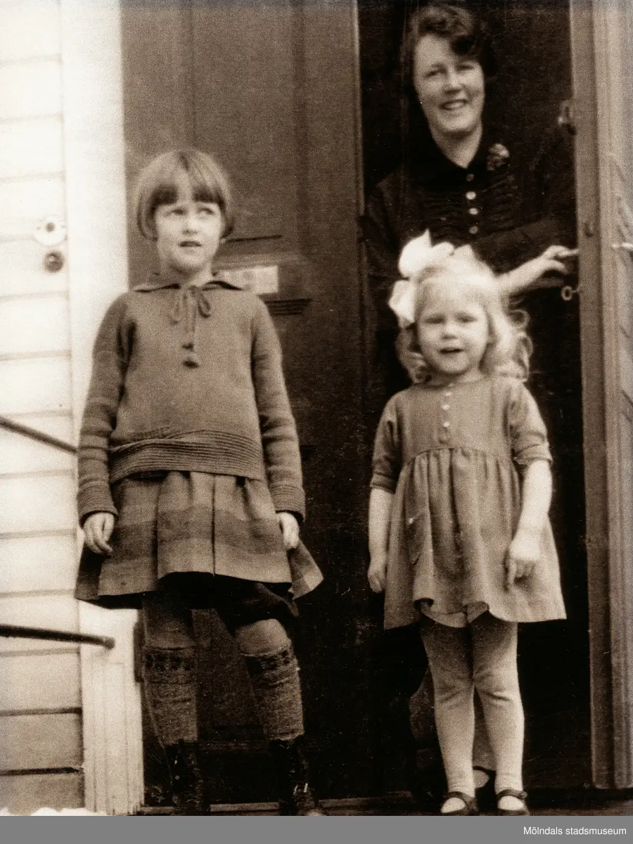 Laila Björck står i dörren till Dr Björcks villa, Villa Björckås, i Åby, Mölndal. ca år 1928. Framför står döttrarna Ulla, till vänster, och Bibbi till höger. Laila var hustru till doktor Erik Björck.