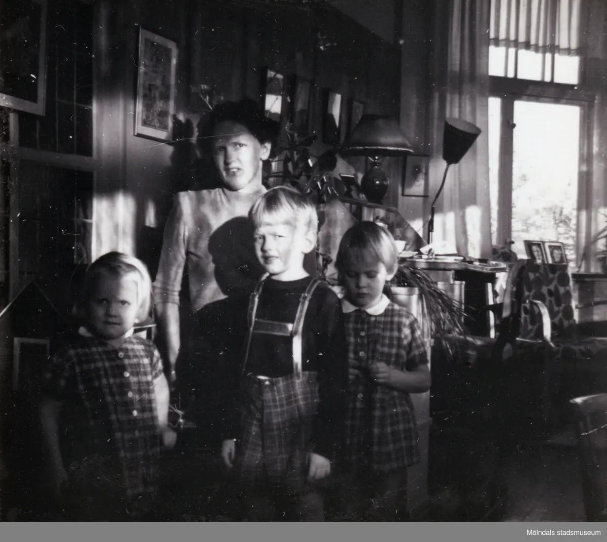Mamma Ulla tillsammans med sina tre äldsta barn, från vänster Angelica, Stefan och Susanne, i inneverandan till Dr Björcks villa, Villa Björckås, i Åby, Mölndal, julen 1954-1955.