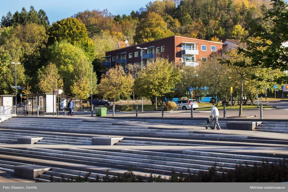 Trapporna från busstationen till Kållereds station. Gamla Riksvägen i Kållereds centrum den 6 oktober 2016. I bakgrunden ses del av huset Streteredsvägen 1.
