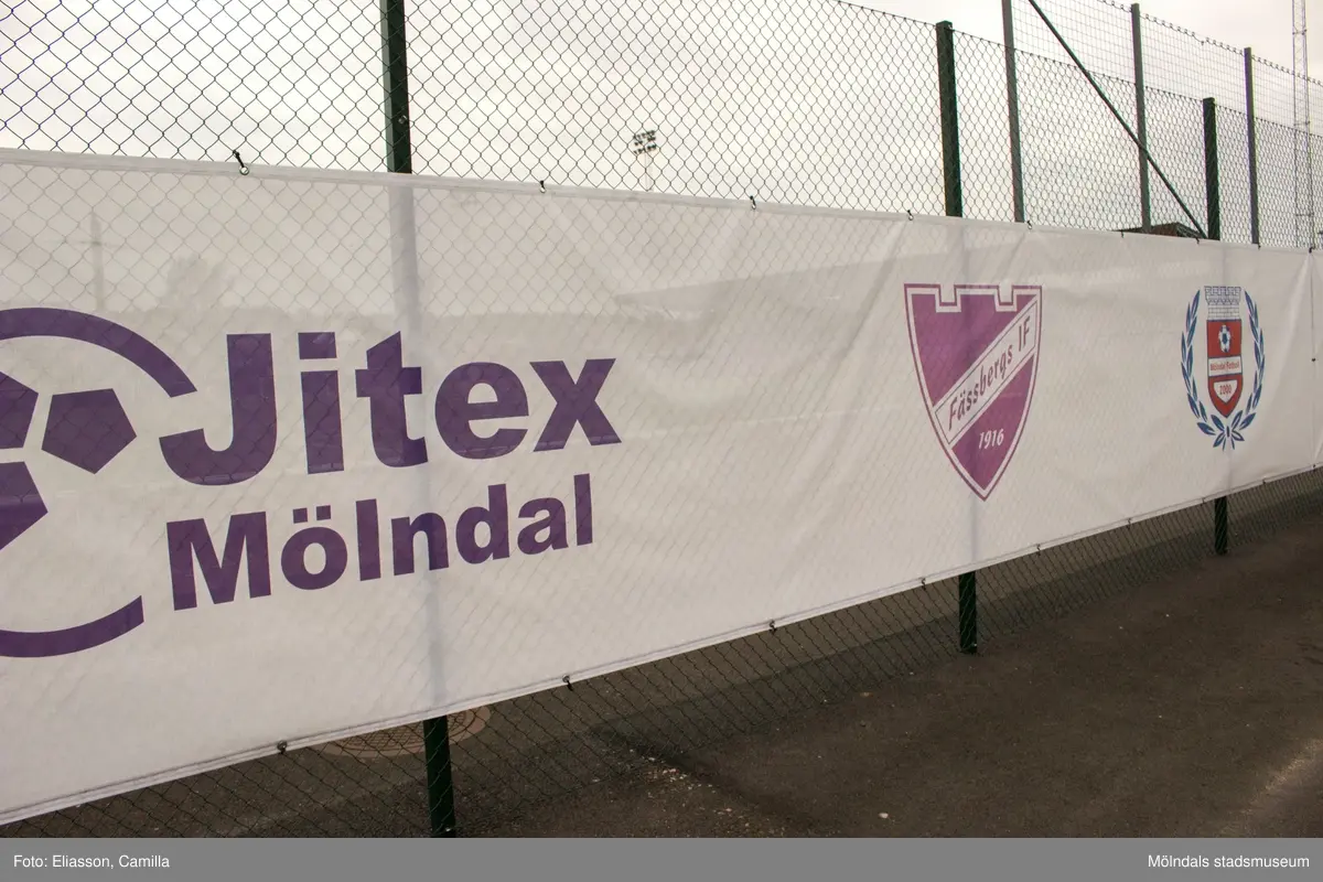 Banderoll som hänger på stängsel till Åbyvallen, som har adressen Idrottsvägen 3 i Åby, Mölndal, den 11 oktober 2016. Banderollen visar tre mölndalsfotbollslags märken. Jitex BK, Fässbergs IF samt Mölndal Fotboll.