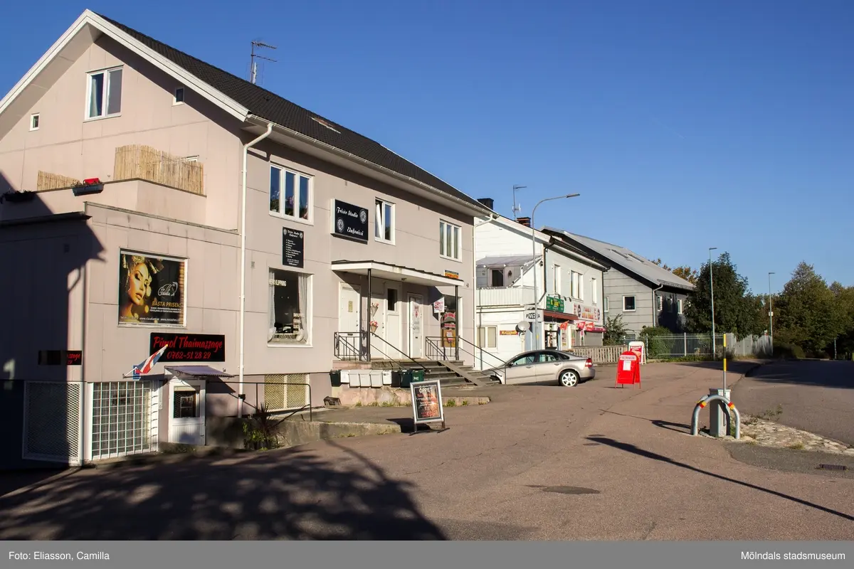 Gamla Riksvägen i rktning mot norr. Kållereds centrum den 6 oktober 2016. Från vänster ses husen Gamla Riksvägen 40, 38 samt 36.