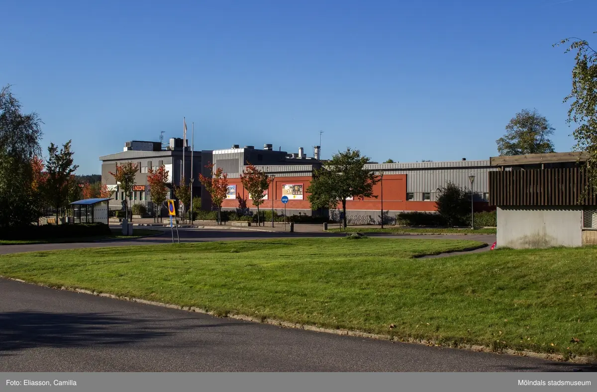 Vy från Valåsvägen mot affärsbebyggelse i Lindome centrum den 4 oktober 2016. Till vänster Almåsgången 1 och till höger ICA Supermarket i huset Almåsgången 2. Fasaderna vetter mot öster.