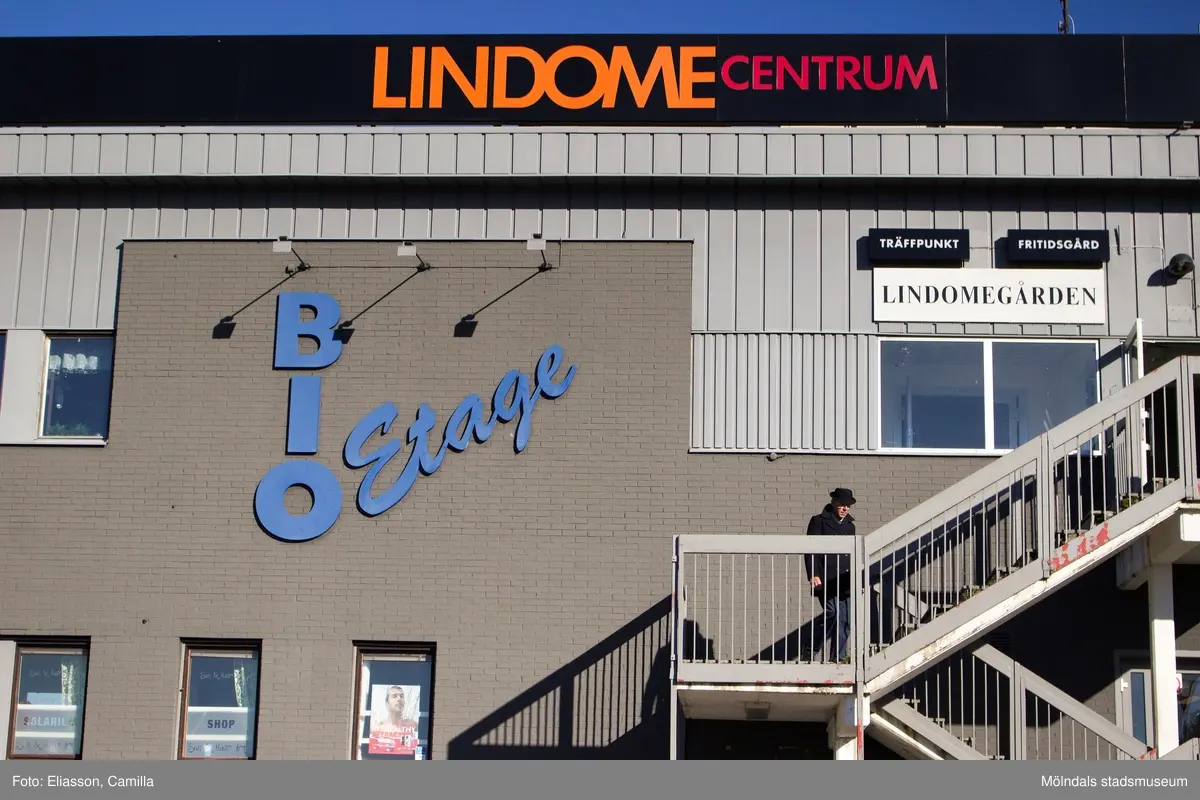 Huset Almåsgången 1 i Lindome centrum den 4 oktober 2016. Trappa och entré till Bio Etage och fritidsgården Lindomegården. Byggnadens fasad vetter mot söder.